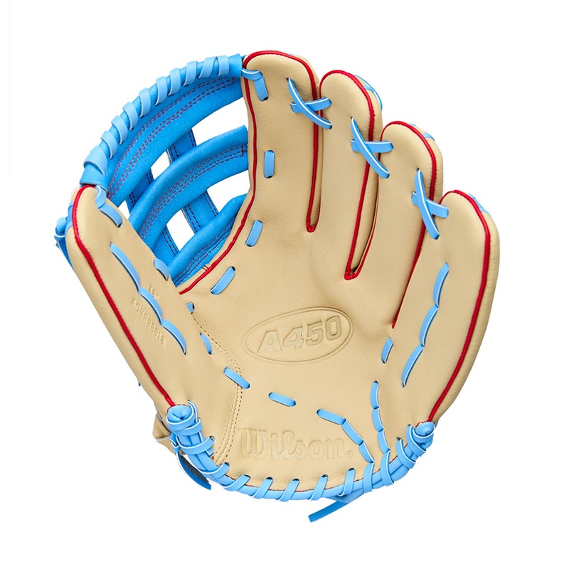 The A450 12 Youth Glove helps young players secure the ball with ease. Featuring Wilsons iconic H-Web design, an elastic Quick Fit Wrist and soft-and-sturdy top grain leather, the A450 is ready to hit the field right away with a snug, lightweight feel that helps young players make every catch with total confidence.